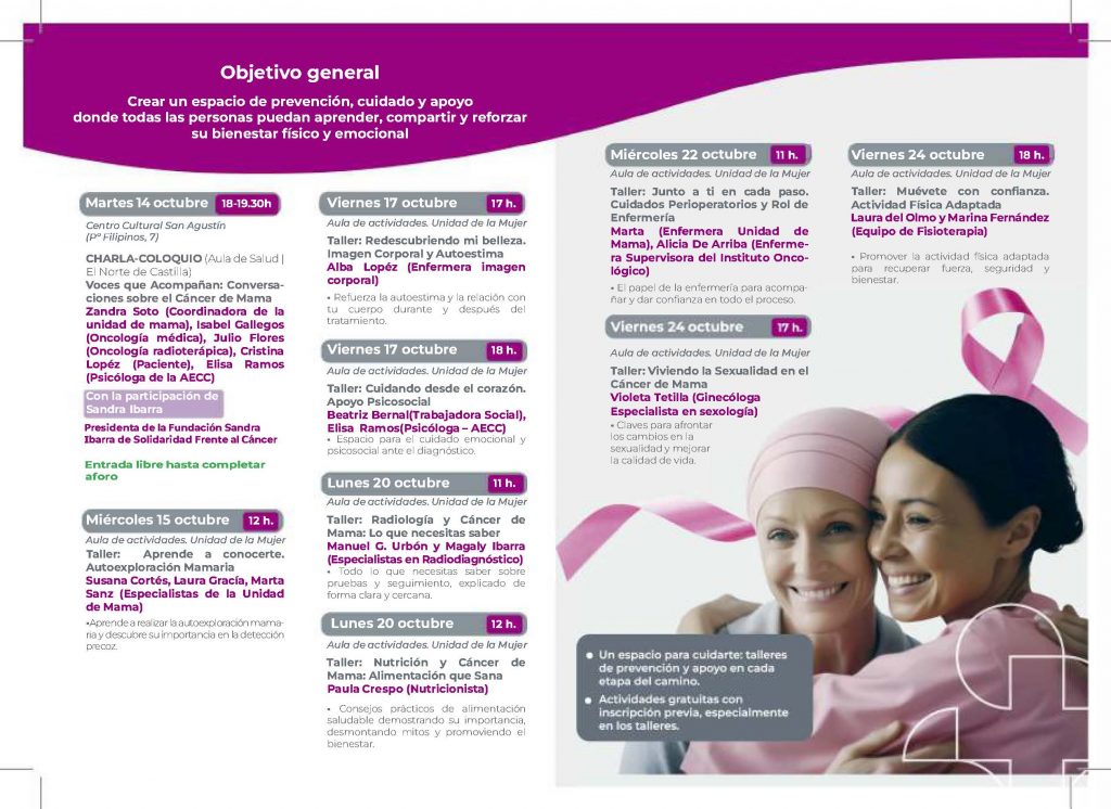 Del 14 al 24 de octubre, se celebrará una completa agenda de talleres, charlas y encuentros abiertos al público, con el objetivo de promover la detección precoz del cáncer de mama, fomentar la autoexploración mamaria y acompañar emocionalmente a las pacientes y sus familias.